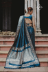 A stunning saree crafted in the enchanting hue of German blue. The fabric, satin silk, drapes gracefully, caressing the skin with its luxurious texture.
