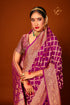 As seen on Natasha Luthra, this exquisite Khaddi Georgette Banarasi Saree is adorned with an all-over diamond lattice in a jaal pattern and ambi (paisley) border. The saree has been hand-dyed in a vibrant magenta shade interspersed with classic gold zari work. Its sheer and lightweight texture drapes gracefully, making it a perfect choice for those who appreciate style and heritage.
