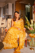 As seen on Aahana Kumra, this exquisite Khaddi Georgette Banarasi Saree is adorned with an all-over diamond lattice in a jaal pattern and floral border. The saree has been hand-dyed in a vibrant yellow shade interspersed with classic gold zari work. Its sheer and lightweight texture drapes gracefully, making it a perfect choice for those who appreciate style and heritage.